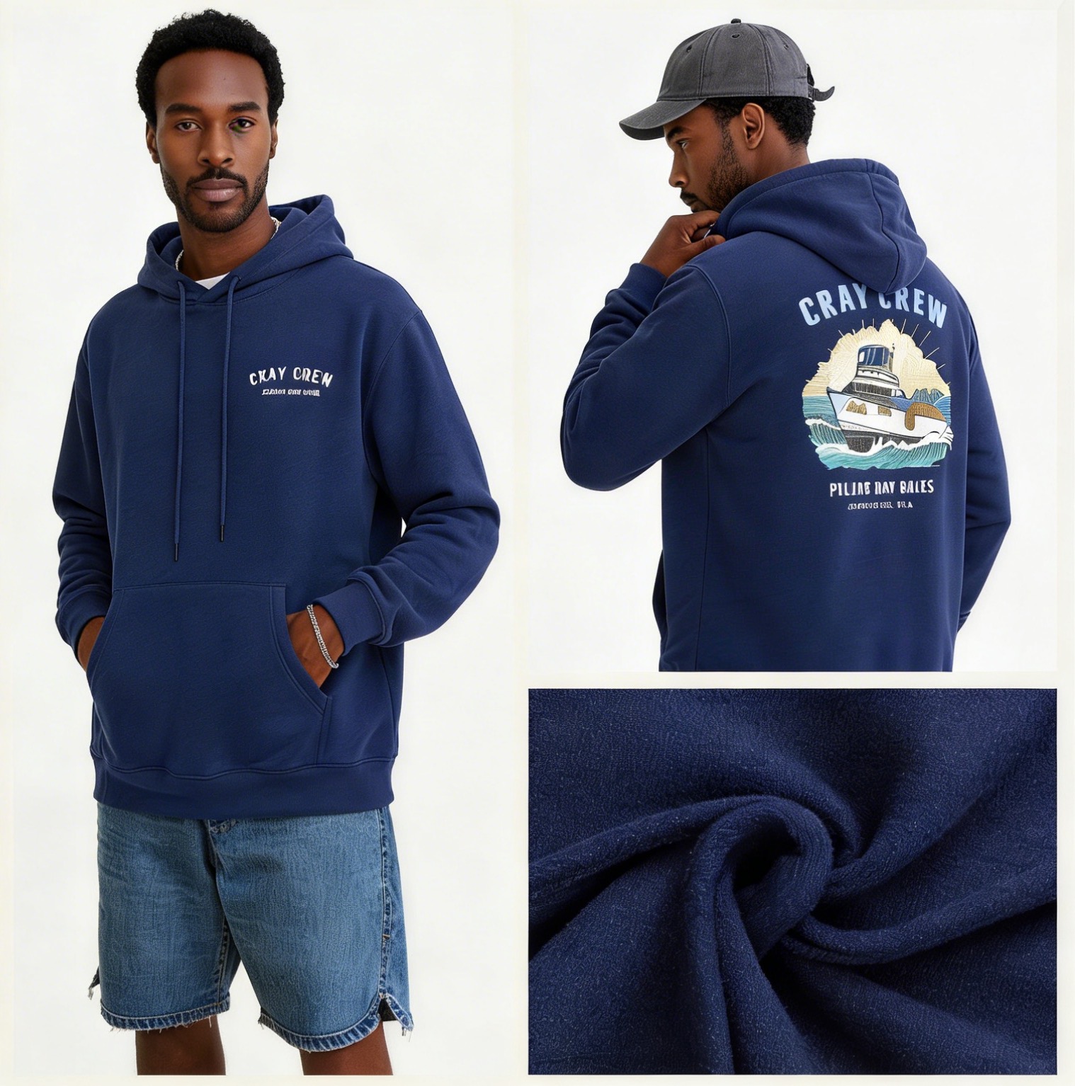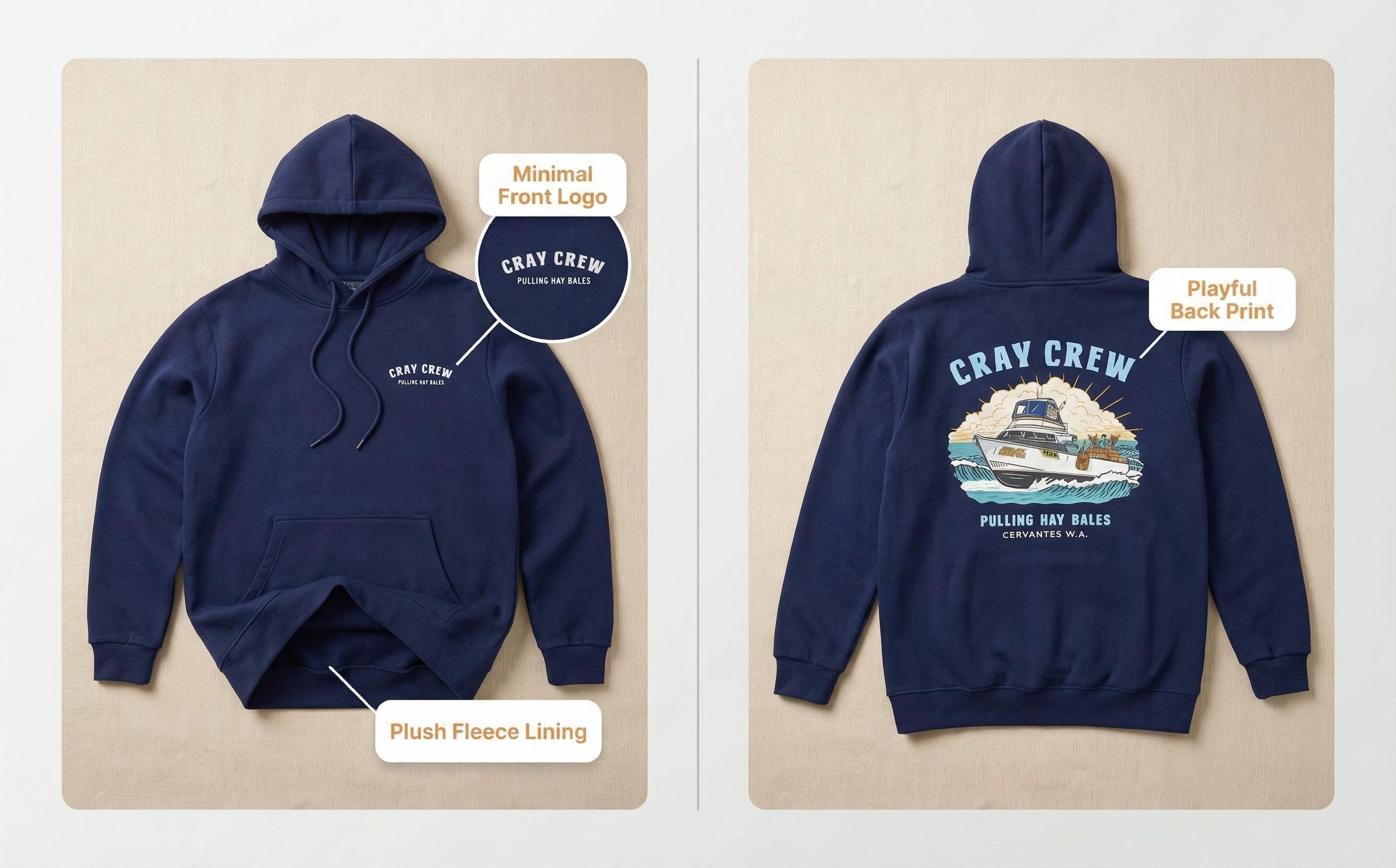 On the front left chest, there is a simple “CRAY CREW PULLING HAY BALES” logo, which is understated and not flashy. On the back, there is a yacht-themed print with an American retro style, paired with the “CRAY CREW PULLING HAY BALES CERVANTES W.A.” logo. The design is very eye-catching and showcases individuality. The fit is loose, suitable for various occasions such as school, casual gatherings, and home, and can be easily combined with khaki pants or jeans to create a Japanese or American street style.